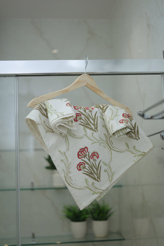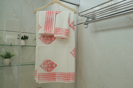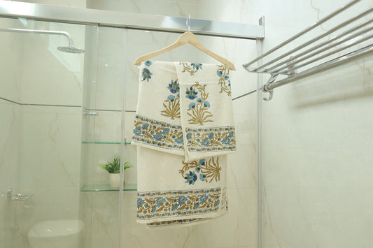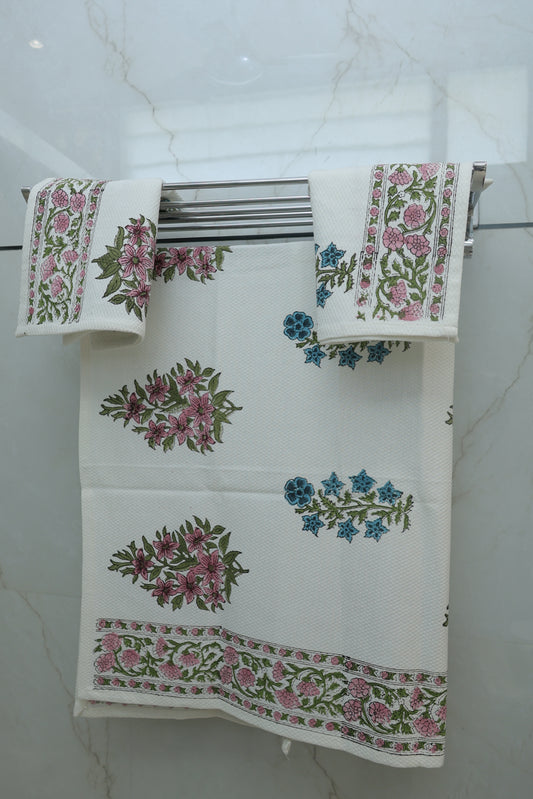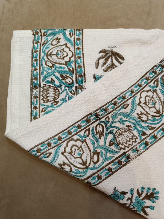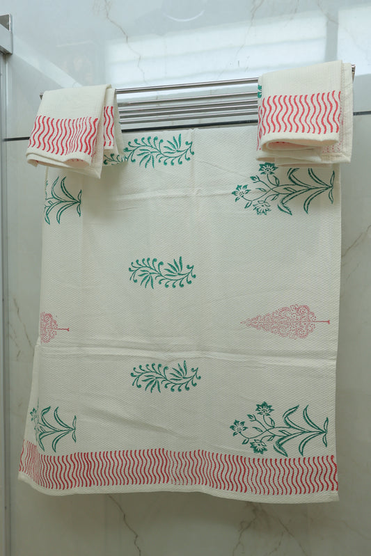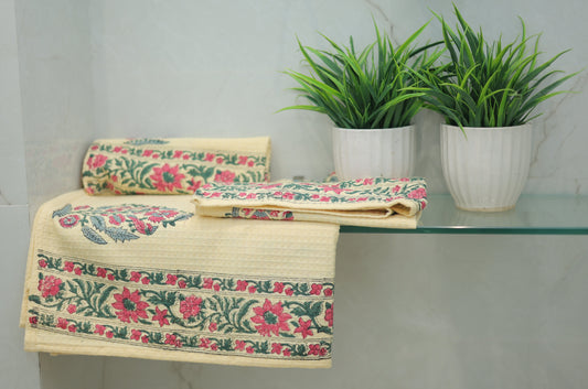 Enjoy the ultimate luxury with our high-quality towels made from super absorbent waffle fabric, perfect for fast drying and convenient daily use. Great for travelers, they're lightweight and simple to carry, enhancing your bathroom experience effortlessly. Decorated with beautiful hand block prints and shiny designs, our towels are crafted from top-notch cotton, guaranteeing a lavish feel every time you use them.
