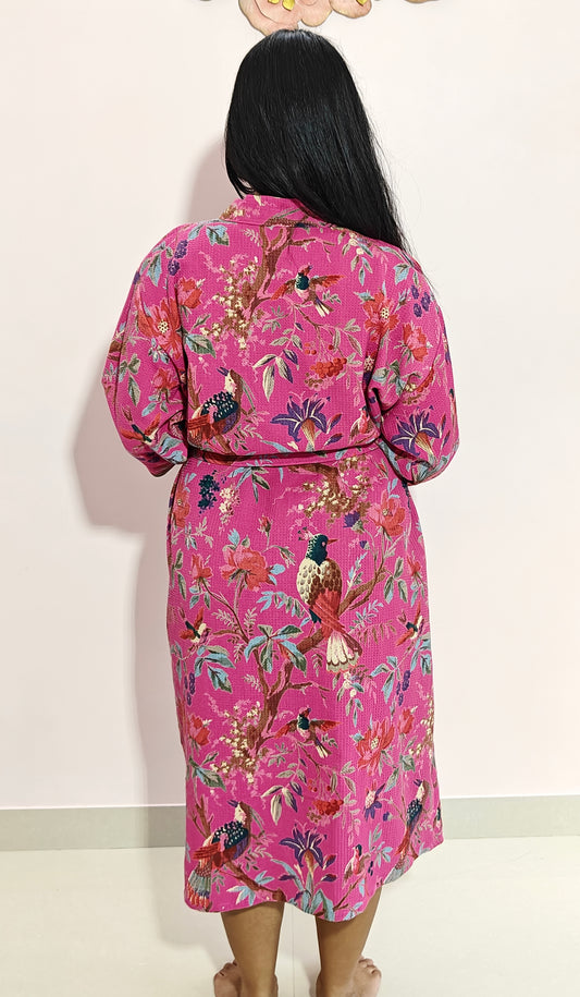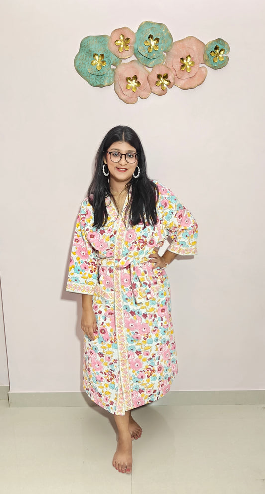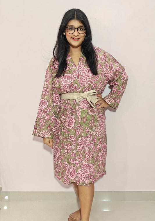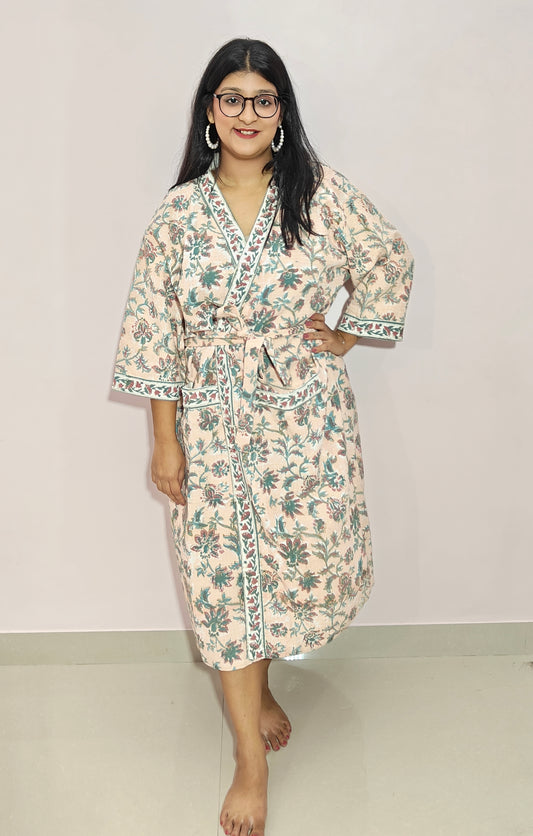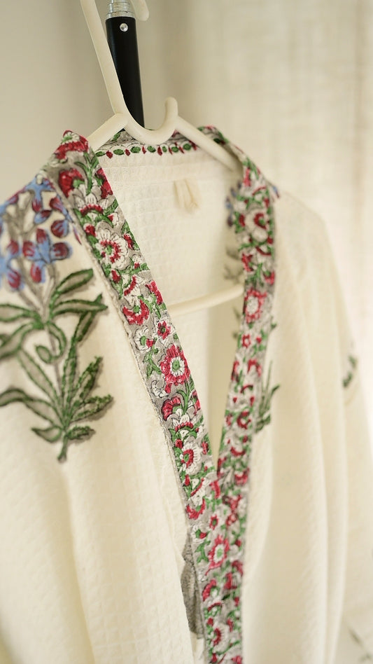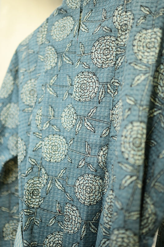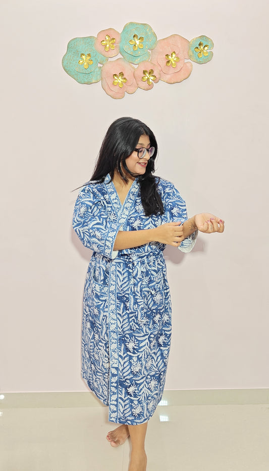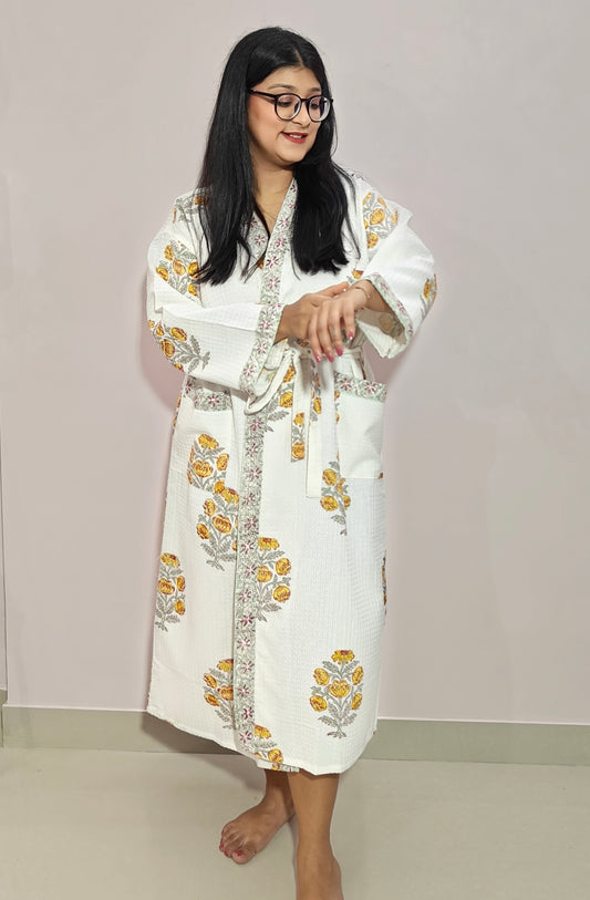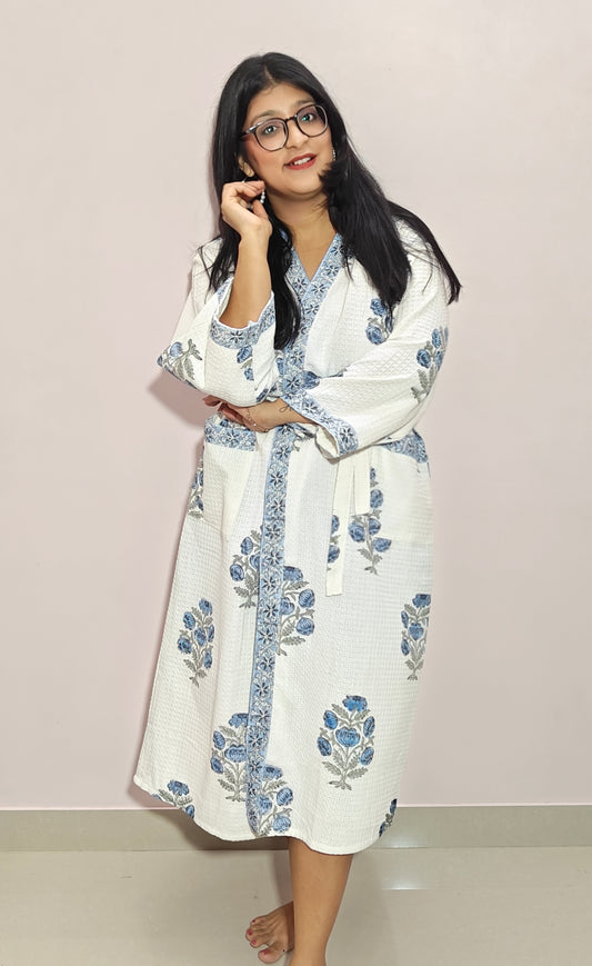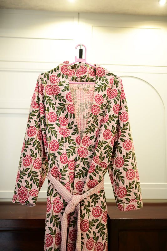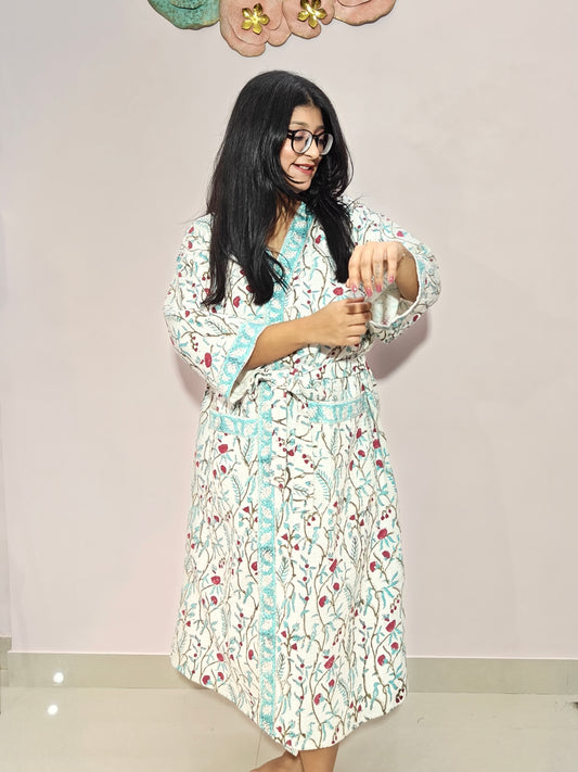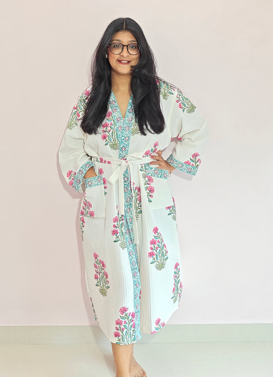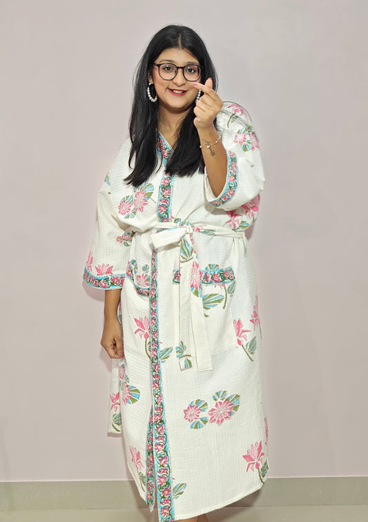 Indulge in luxury with our premium cotton bath robes, crafted with soft waffle fabric for ultimate comfort. Adorned with exquisite floral prints or traditional Jaipuri block patterns, these robes are ideal for gifting, whether for weddings or bridesmaids. Perfect for new brides and travel-friendly, they offer a blend of elegance and practicality.