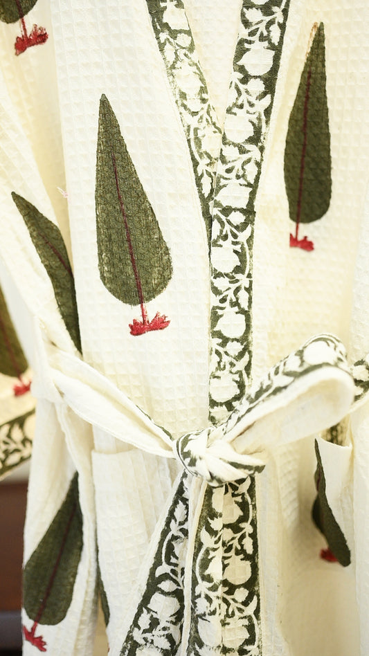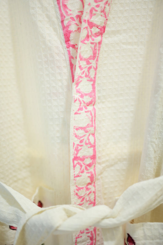 Indulge in luxury with our premium cotton bath robes, crafted with soft waffle fabric for ultimate comfort. Adorned with exquisite floral prints or traditional Jaipuri block patterns, these robes are ideal for gifting, whether for weddings or bridesmaids. Perfect for new brides and travel-friendly, they offer a blend of elegance and practicality.