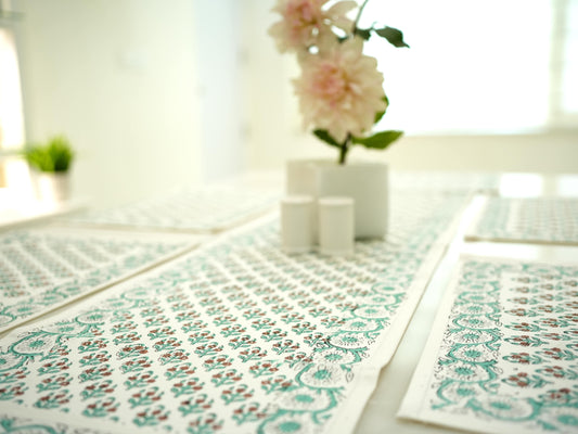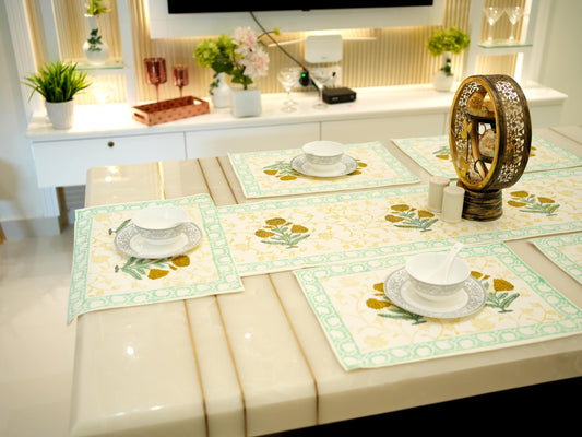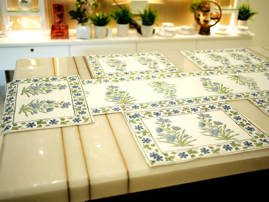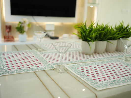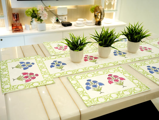 Handblock print dining covers, sets of runners, mats, and napkins instantly elevate any living space with their rich and luxurious look. Ideal for everyday use or festive occasions like dinner parties and celebrations, they add a touch of elegance and charm, enhancing the ambiance with their exquisite designs and craftsmanship.