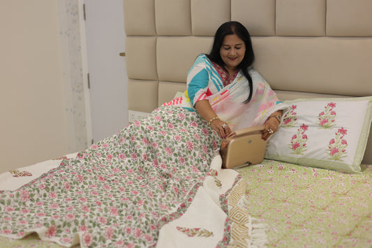 Introducing our Jaipur Collection Bedsheets: crafted with care and dedication, epitomizing comfort and style. Made from premium fabric, each meticulously handcrafted using traditional techniques. Our artisans infuse love and expertise, ensuring impeccable craftsmanship and eco-friendliness with natural colors. Luxuriously soft, perfect for unwinding, unmatched comfort and machine washable. Experience Jaipur's charm in your bedroom with sizes available for king and super king beds. Tradition meets modern comfort; every thread tells a story of heritage and craftsmanship.