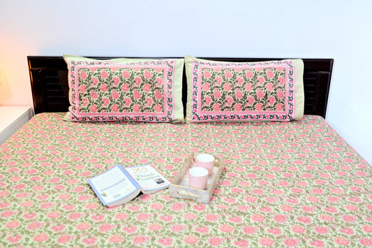 Rosy Blossom Jaipuri Print Double Bed King Size Bedsheet with 2 Pillow Covers