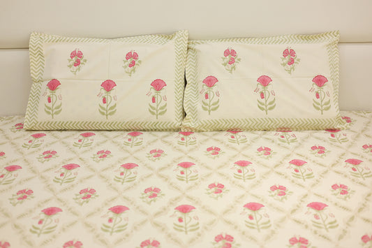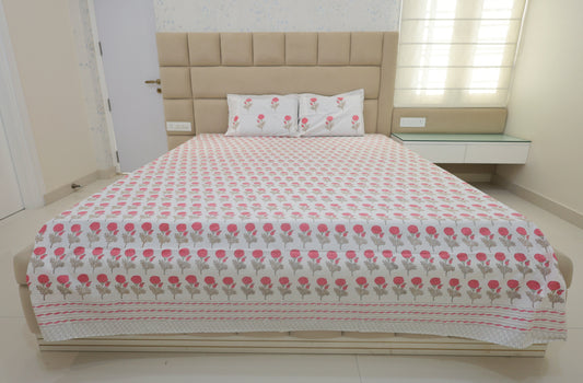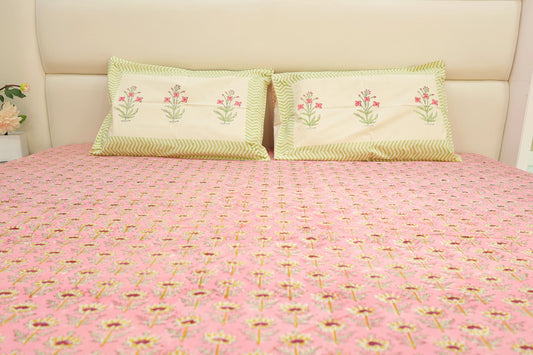Pink Posy Paradise Jaipuri Print Double Bed King Size Bedsheet with 2 Pillow Covers