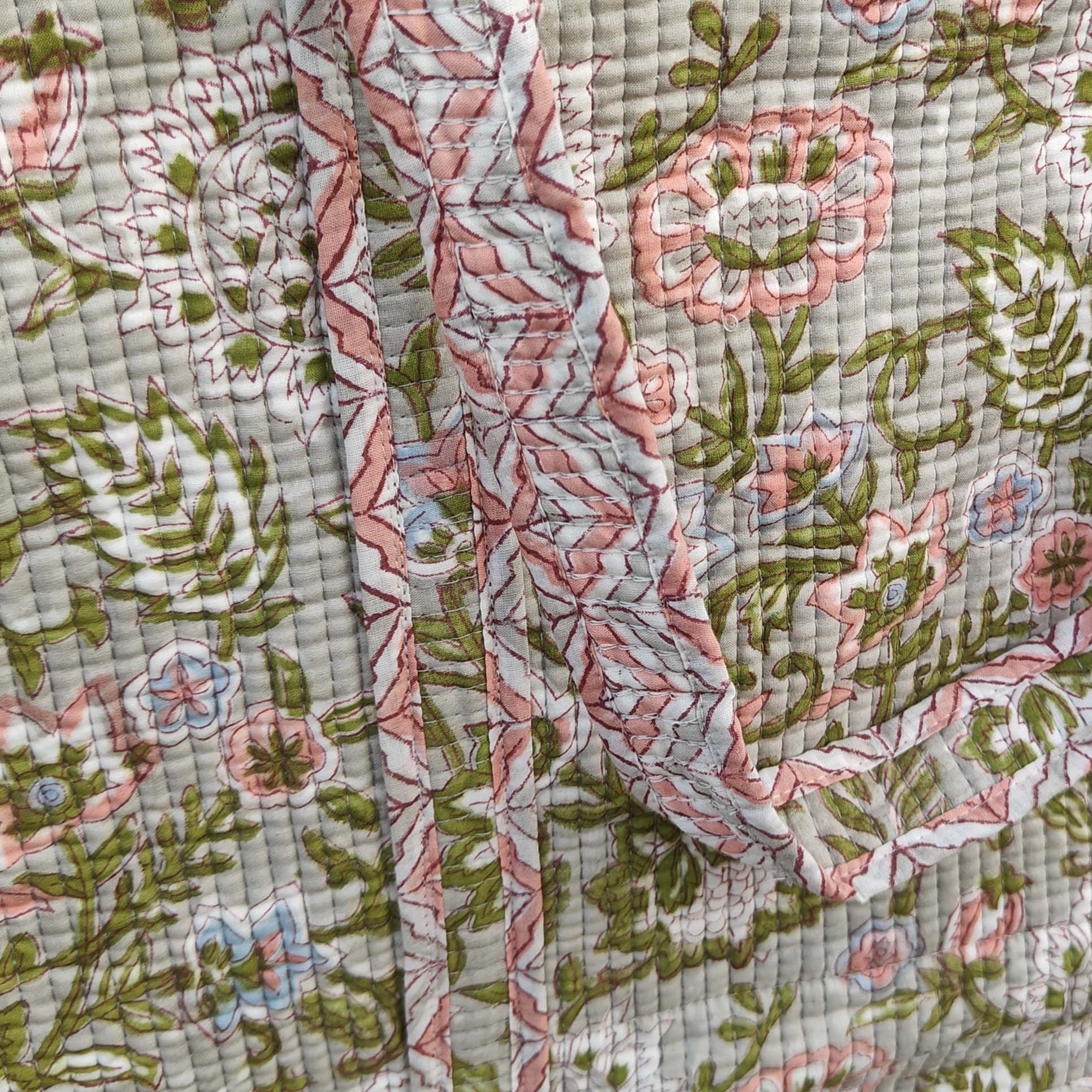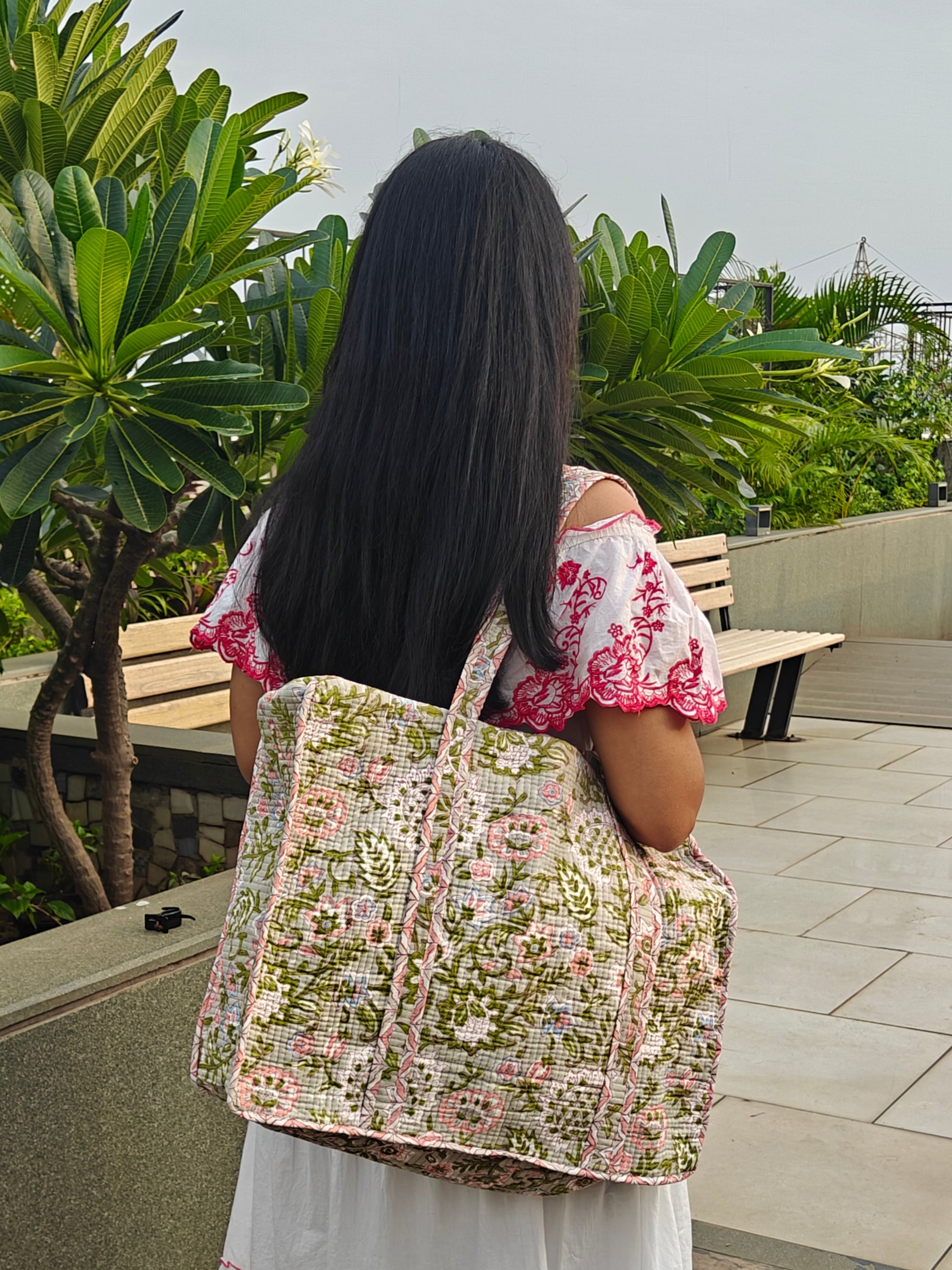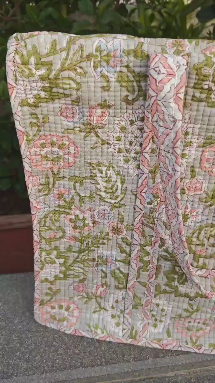Elevate your everyday style with our premium handblock printed quilted cotton tote bag. Crafted from high-quality cotton, this spacious 14x20 inch tote bag is both stylish and functional—perfect for daily use, travel, beach days, shopping, or office essentials. The soft yet durable quilted cotton fabric adds an extra layer of protection, while the sturdy shoulder straps ensure all-day comfort.