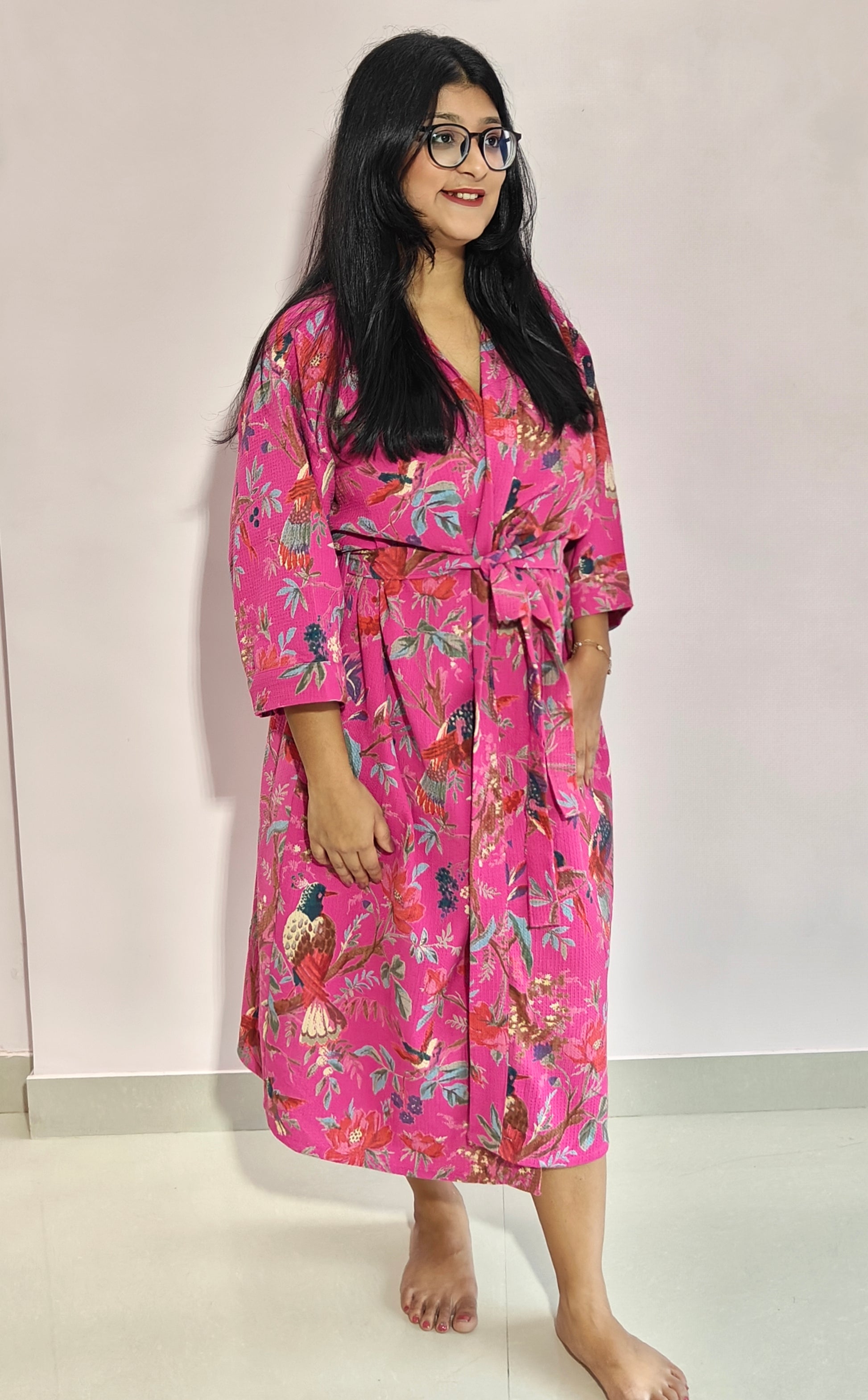 Wrap yourself in luxury with our beautiful and colorful Magenta waffle fabric bathrobes, designed for comfort and style wherever you go. Made from highly absorbent, quick-drying material, these floral bathrobes are perfect for travel, beach vacations, destination weddings, or simply lounging at home. Lightweight and breathable, they pack easily, making them an ideal robe for everyday use or gifting. Elevate your self-care routine with these attractive waffle robes that blend fashion with function.