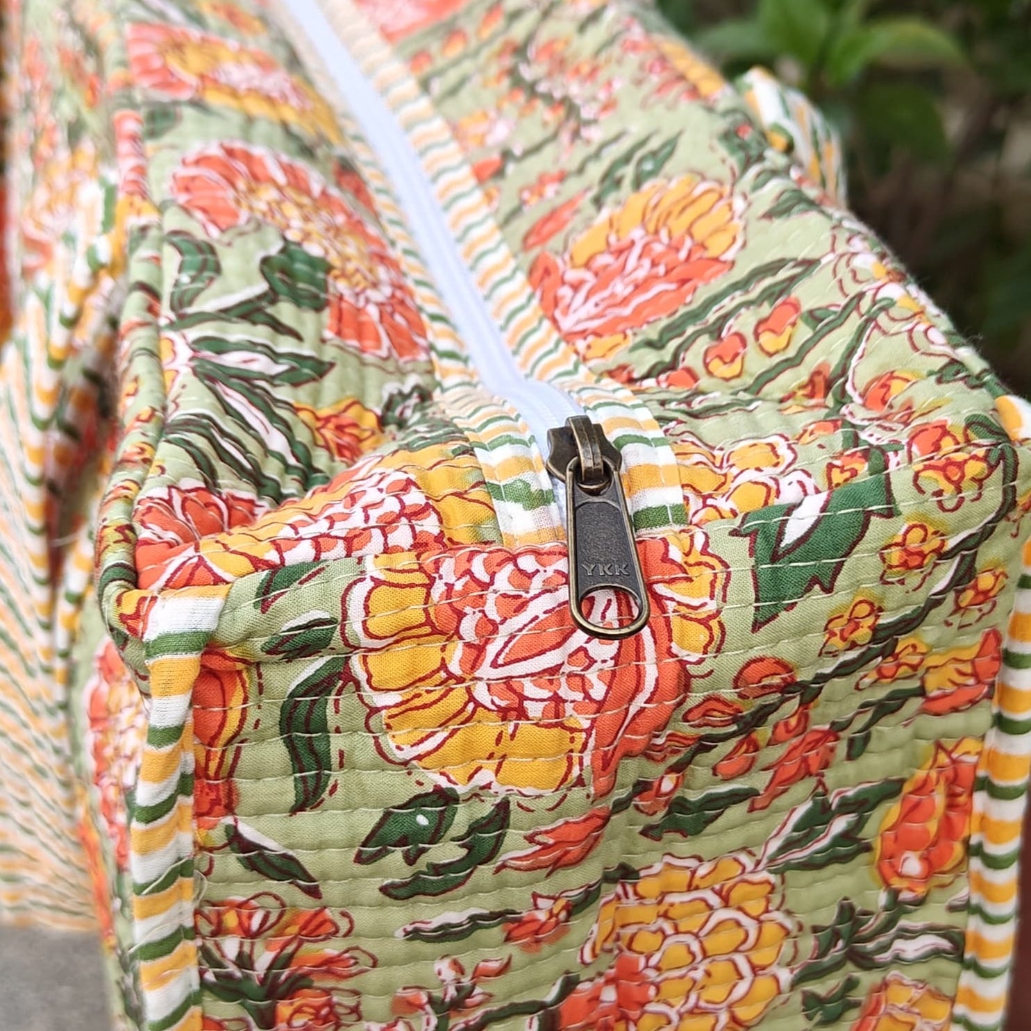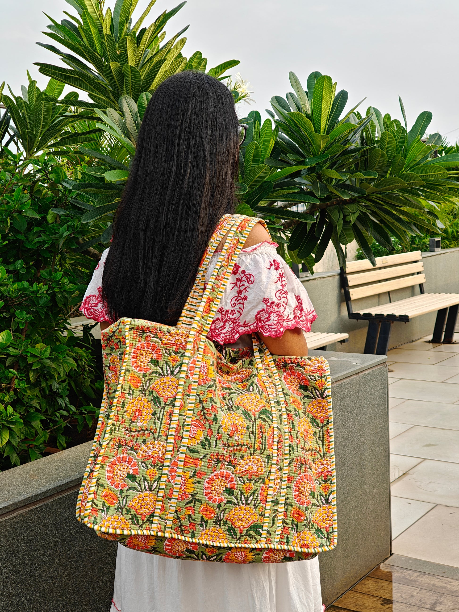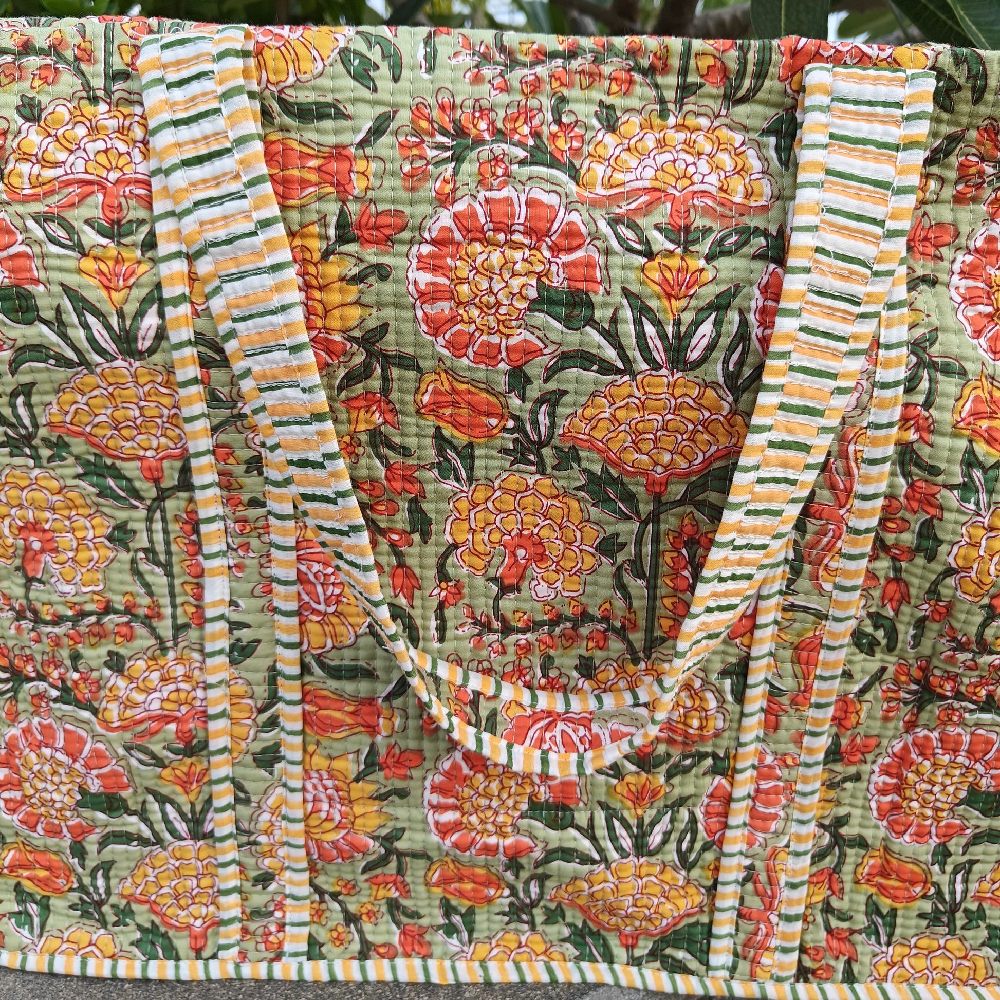 Elevate your everyday style with our premium handblock printed quilted cotton tote bag. Crafted from high-quality cotton, this spacious 14x20 inch tote bag is both stylish and functional—perfect for daily use, travel, beach days, shopping, or office essentials. The soft yet durable quilted cotton fabric adds an extra layer of protection, while the sturdy shoulder straps ensure all-day comfort.