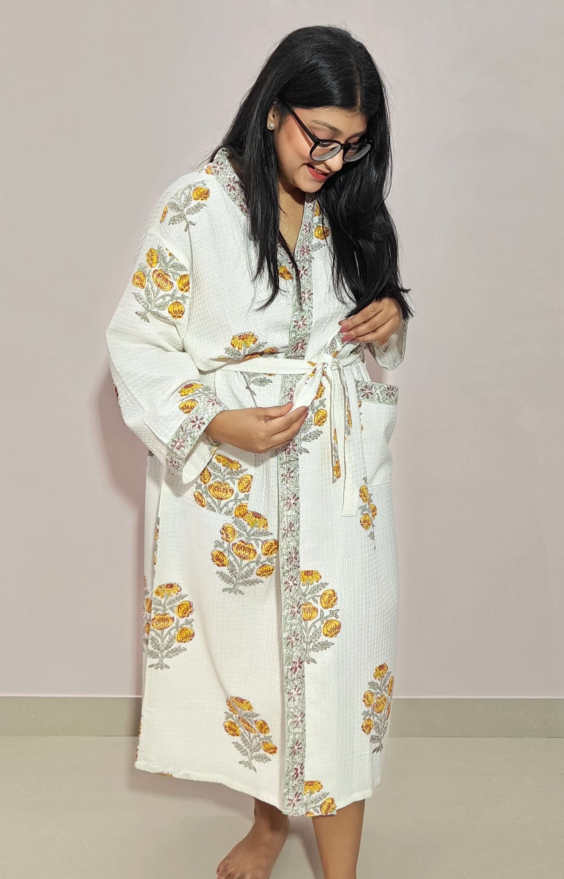 Wrap yourself in luxury with our beautiful golden yellow floral waffle fabric bathrobes, designed for comfort and style wherever you go. Made from highly absorbent, quick-drying material, these floral bathrobes are perfect for travel, beach vacations, destination weddings, or simply lounging at home. Lightweight and breathable, they pack easily, making them an ideal robe for everyday use or gifting. Elevate your self-care routine with these attractive waffle robes that blend fashion with function.