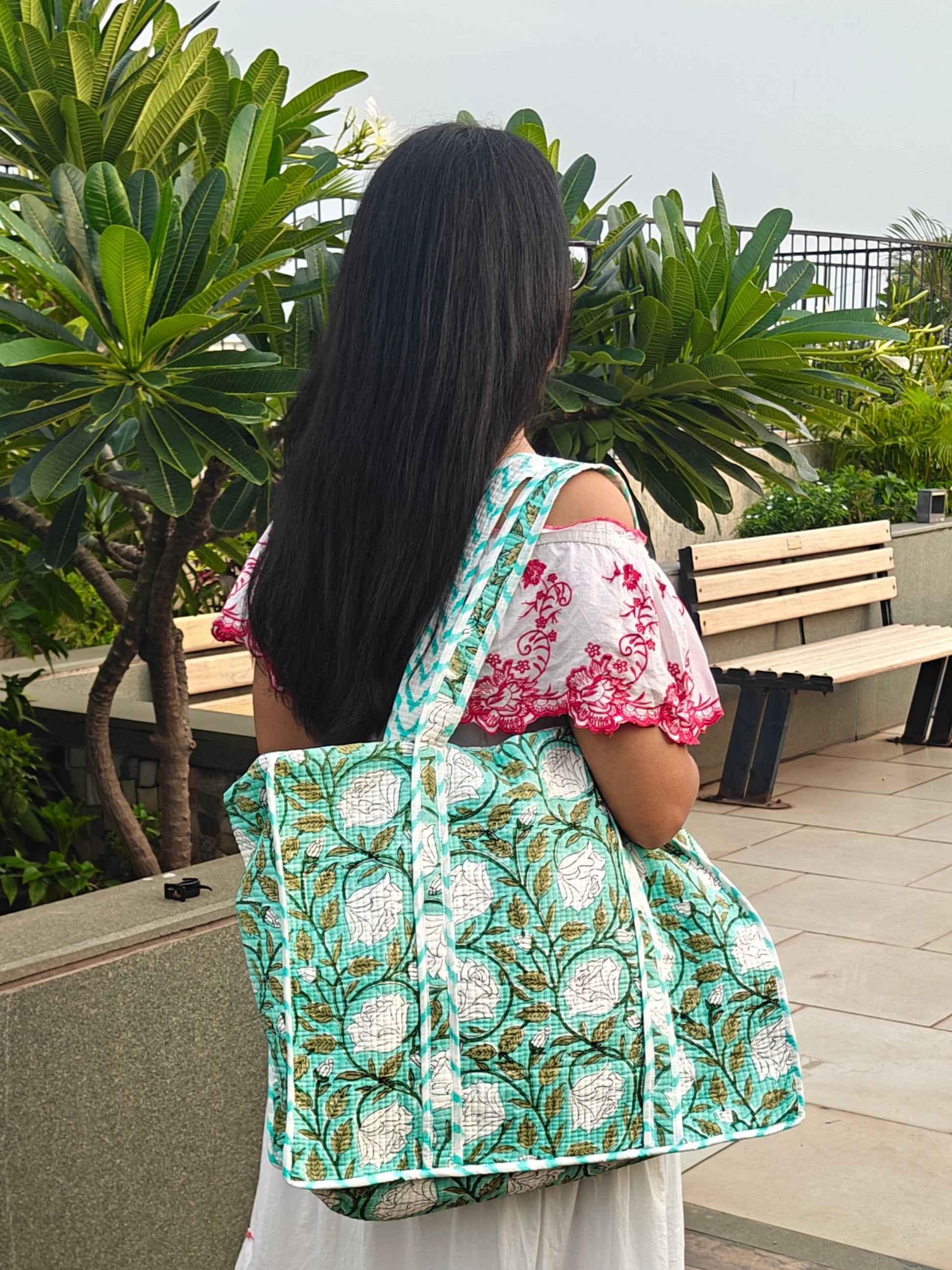 Elevate your everyday style with our premium handblock printed quilted cotton tote bag. Crafted from high-quality cotton, this spacious 14x20 inch tote bag is both stylish and functional—perfect for daily use, travel, beach days, shopping, or office essentials. The soft yet durable quilted cotton fabric adds an extra layer of protection, while the sturdy shoulder straps ensure all-day comfort.